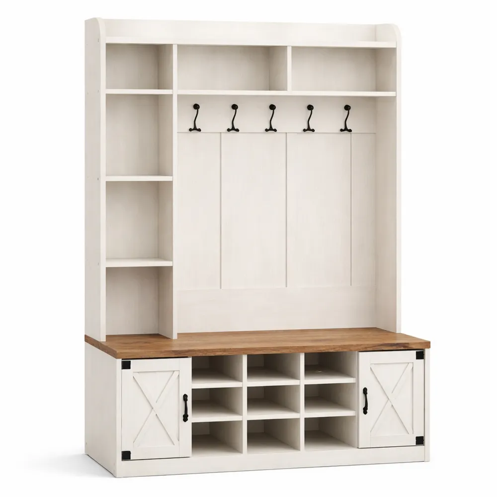 Ce porte-manteau propose un éclairage LED RGB avec six bandes lumineuses réglables pour créer différentes ambiances. Il offre un banc intégré, porte-manteau, étagère à chaussures, étagère latérale à trois niveaux, compartiments de rangement et étagère supérieure. L'armoire dispose d'une tringle à vêtements, de nombreux compartiments, crochets, placards et étagère ouverte. Les étagères inférieures sont réglables et amovibles pour optimiser l'espace pour divers objets. Fabriquée en bois, elle assure robustesse et durabilité.